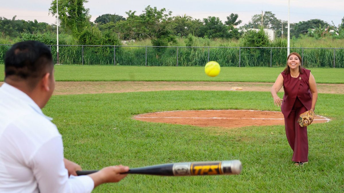 La presidenta municipal, Mari Luz Velázquez Jiménez, realizó el lanzamiento de la primera bola en la gran final de softbol varonil, acompañada por familias y deportistas.