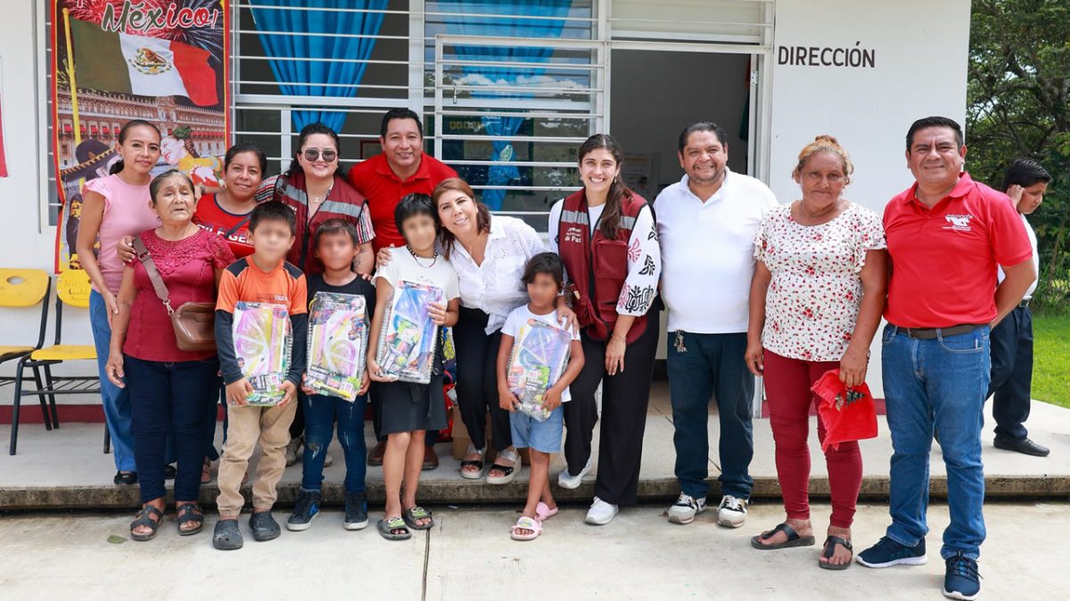 Este lunes, la presidenta municipal de Huimanguillo, Mari Luz Velázquez Jiménez, entregó útiles escolares a seis niñas y niños de la ranchería Otra Banda 2ª sección que se incorporan al sistema educativo de CONAFE.